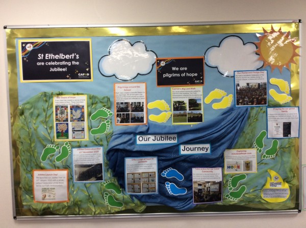 This year, the Faith Ambassadors are very excited to help our Catholic Life Team to celebrate the Year of the Jubilee with the school. We are recording our Jubilee Journey on a map in our front entrance for all to see. Our Faith Ambassadors launched our Jubilee Year with a special Celebration of the Word in January 2025 and helped their classes to create a canvas of hope for their classroom door. The idea is that God is behind every door offering hope to us all. Take a look at their beautiful art work below. We also spelt out the word HOPE on the playground using a drone on our Jubilee Celebration Day!
